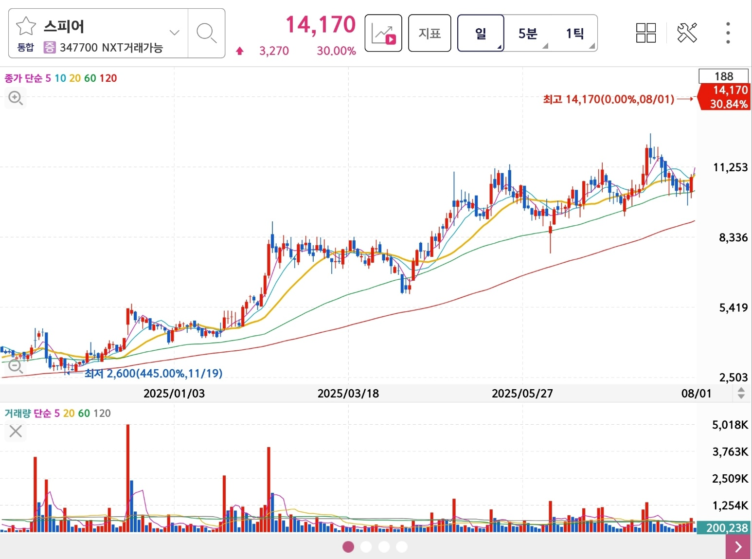 2025년 8월 1일, 스페이스X와의 장기 계약 체결 소식이 알려지면서 단숨에 상한가를 기록했습니다. 최근 주가 상승으로 인해 한국거래소로부터 투자주의, 투자경고종목으로 지정될 만큼 과열 양상을 보이기도 했습니다. 52주 최저가 2,210원에서 최근 최고가 14,170원까지 가파르게 상승한 흐름은 시장의 높은 기대감을 반영하고 있습니다.