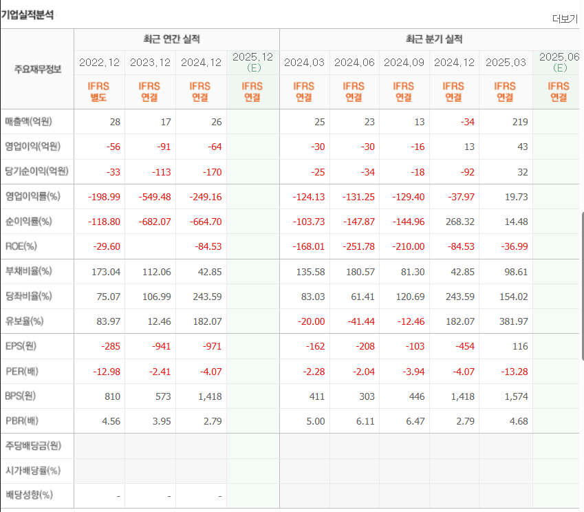 - 2023년에 걸쳐 지속적인 적자와 높은 부채비율로 인해 불안정한 모습을 보였으나 2024년 말부터 실적 개선의 조짐이 나타남.