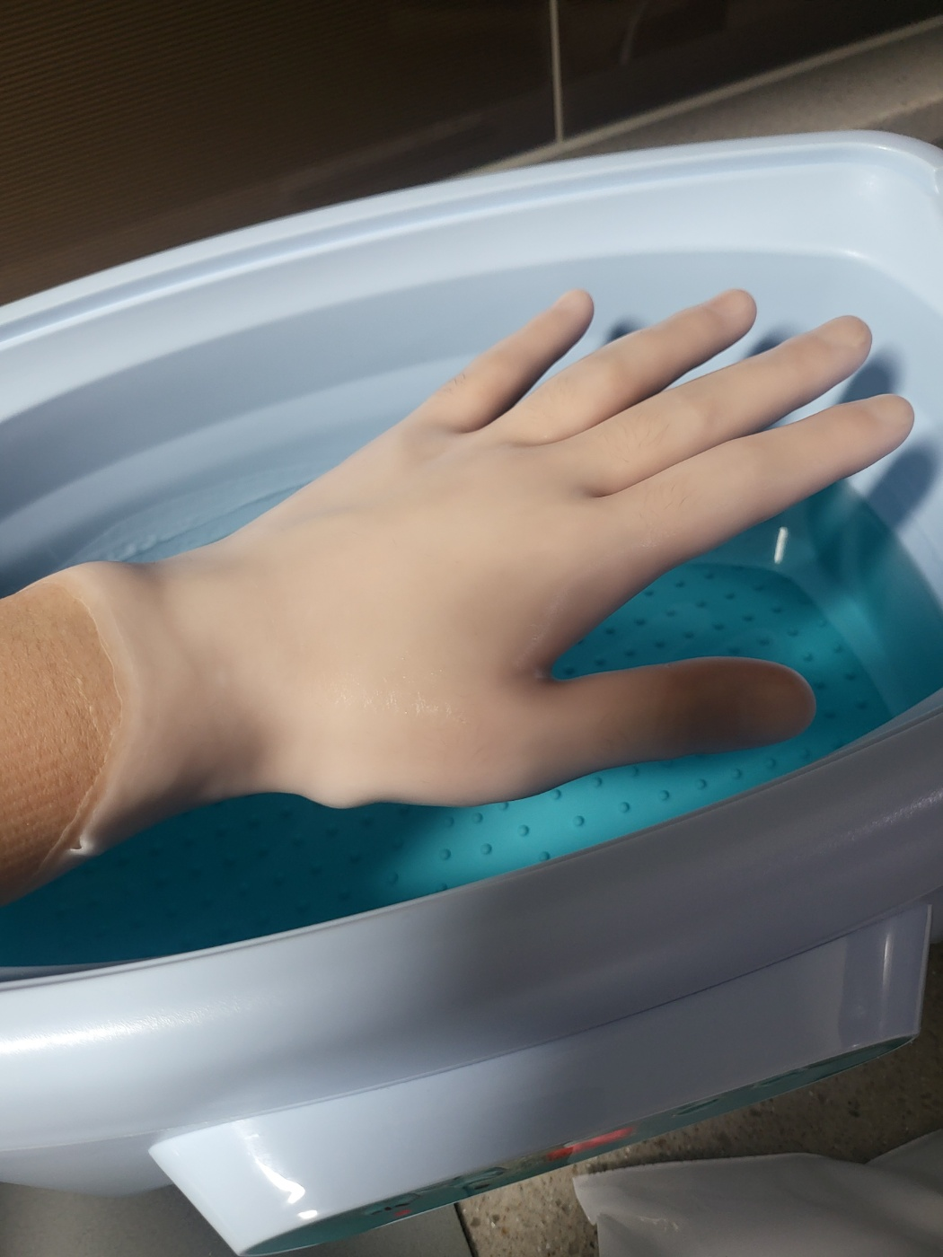 따뜻하게 녹은 파라핀 왁스에 손을 담그는 순간, 마치 온탕에 들어간 것처럼 시원하면서도 따뜻한 느낌이 온몸으로 퍼지는 기분이었어요. 설명서대로 1~2초 담그고 4~5초 기다리는 과정을 4~5번 반복했더니, 손에 파라핀 팩이 두껍게 입혀졌습니다. 함께 들어있던 일회용 비닐팩으로 손을 한 번 더 감싸주니 효과가 더 좋아지는 느낌이었어요.