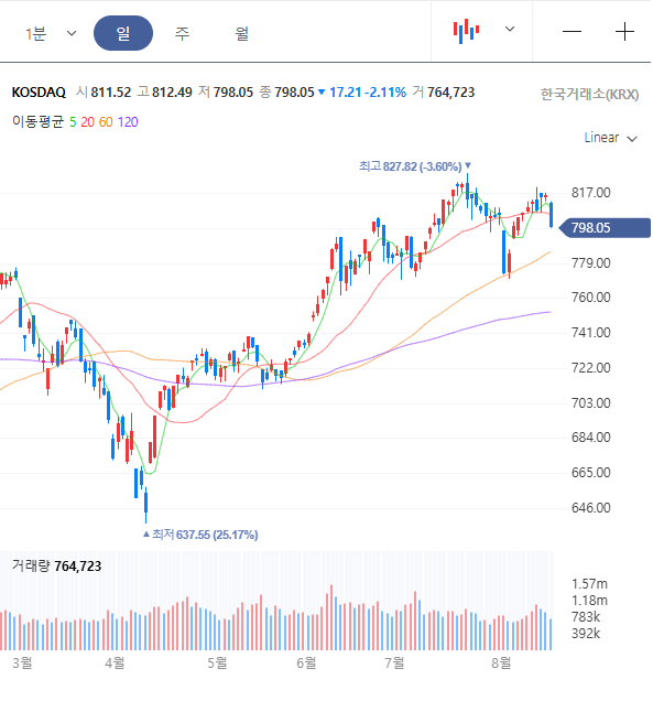 8/18 KOSDAQ 798.05(-2.11%)