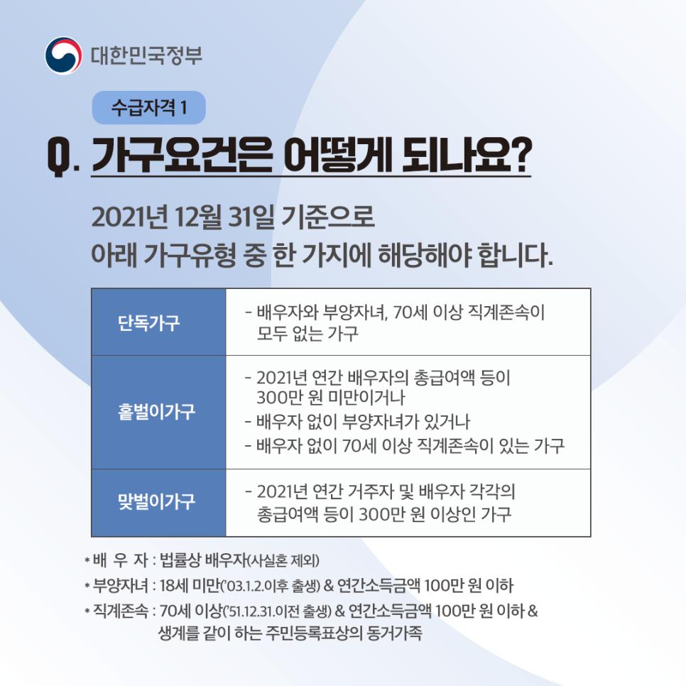 맞벌이 가구: 신청인과 배우자 각각의 총 급여액이 300만 원 이상인 가구