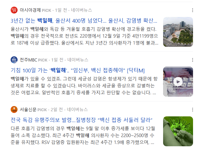 오늘은 백일해에 대해서 알아보려고 합니다. 최근 뉴스에도 보도가 많이 되고 있는 겨울철 호흡기 감염병 질환입니다. 독감, RSV 감염증까지 겨울철 호흡기 질환 환자가 증가세를 보이면서 질병청에서도 백신 접종을 서둘러달라 권고 중입니다.