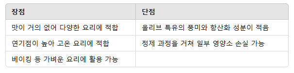 - 퓨어: 고열 요리에 적합, 풍미가 약간 있음.
