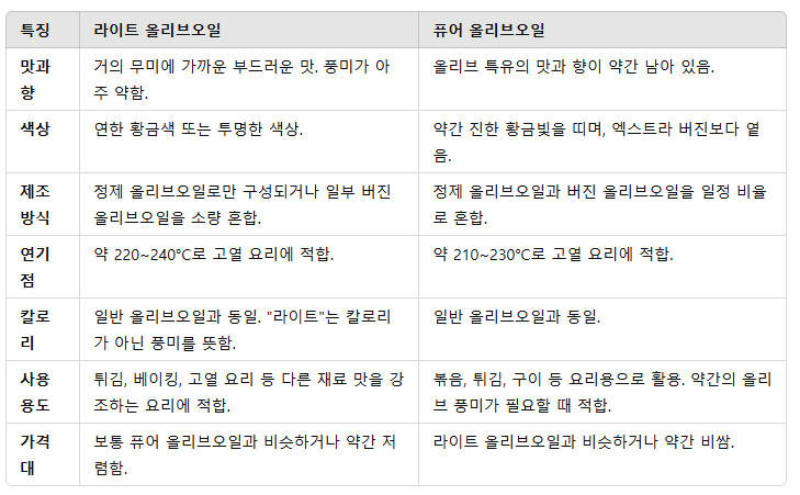 ※ 라이트 올리브오일과 퓨어 올리브오일의 주요 차이점