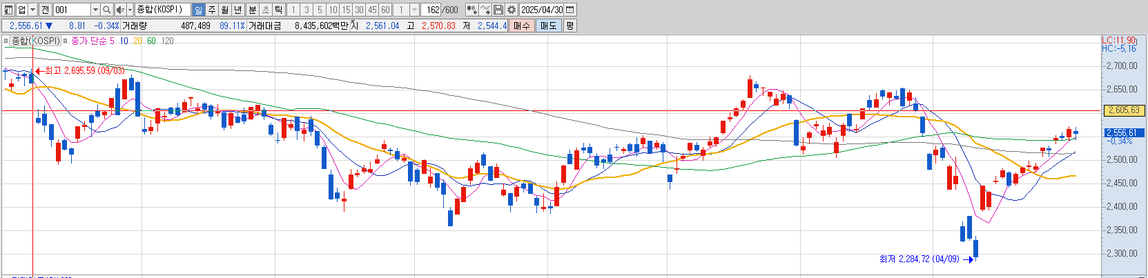 장 막판 낙폭을 더욱 줄인 끝에 2,556.61(-8.81P, -0.34%)에서 거래를 마감.