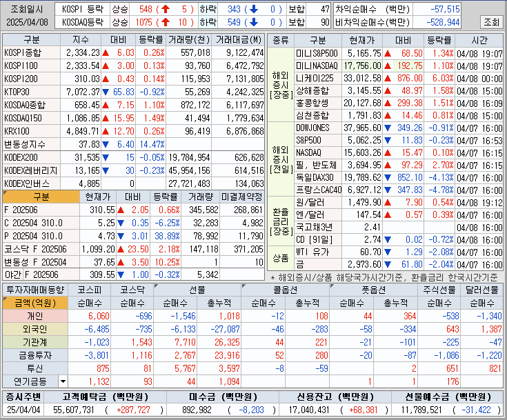 美 급락세 진정(+), 삼성전자 호실적 발표(+), 개인 순매수(+), 관세 불확실성 지속 속 외국인/기관 순매도(-)