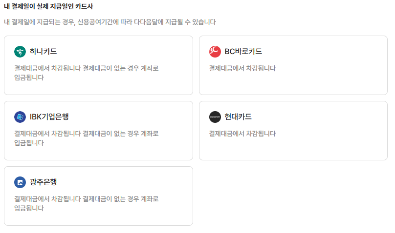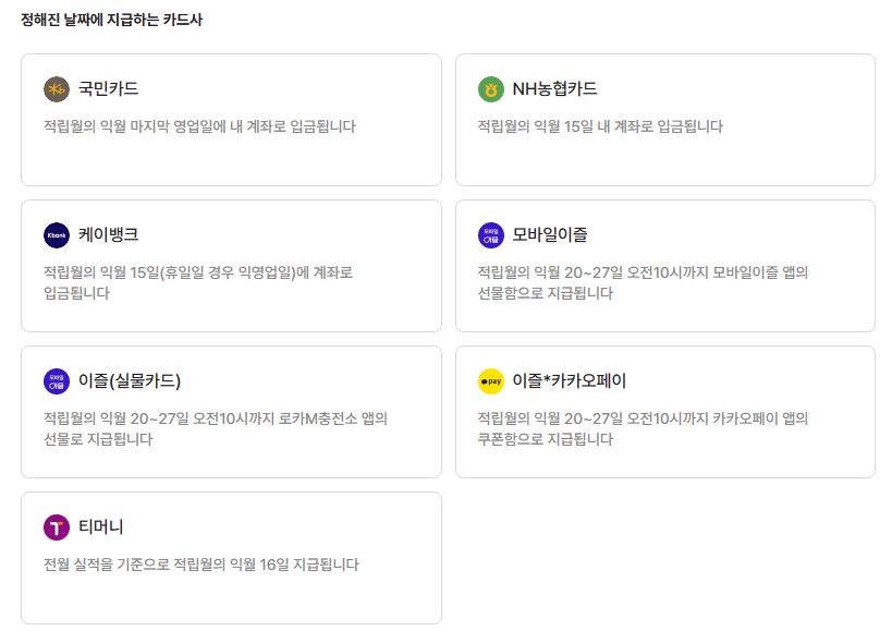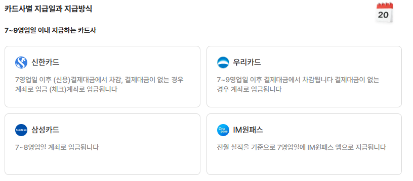 ▶ 지급금액을 카드사로 보내는 기간은 적립월의 익월 5영업일 카드사로 지급 요청됩니다.